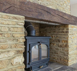 - Large open plan living area with wood burner