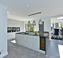 31'8" x 11'6" With access to separate utility space. The kitchen fitted with a range of wall and base units in a light grey finish, a beautiful granite island with a wine fridge, an integrated sink and instant hot water tap, multiple NEF ovens with slide & hide drawers, warmer drawer & microwave, five ring electric induction hob, UPVC patio doors to the rear elevation, grey thermostatically controlled radiators, power and ceiling light points.