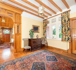 A tiled Portico style porch shelters a solid oak entrance door which opens into a reception hall with an ornate oak carved archway into an inner hall. The reception hall has exposed oak flooring, a high ceiling with exposed oak beams, and deep picture rails. A solid oak full turn staircase with a shallow rise provides access to the first floor and a part stained glass oak door opens to the garden at the side.