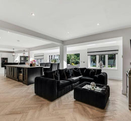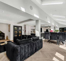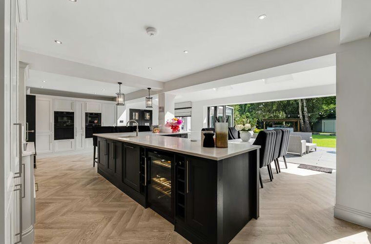 Stepping through the front door you are greeted by an elegant and bright reception hall with stairs rising to the first floor with a built in, glass fronted wine cellar. Doors lead to the home office, guest wc and into the open plan kitchen. Bathed with light thanks windows and bi-fold doors to the rear as well as to six roof windows, the stunning open plan kitchen has well defined areas for relaxing and entertaining with a beautifully fitted kitchen having a range of wall and base units with central 'L' shaped island unit and breakfast bar and a range of integrated appliances. From here, double doors lead to the living room, dining room and games room with a further door leading to the laundry room. The sumptuous living room is a relaxing yet elegant space with views over the front, feature fireplace with log burning stove and double doors opening into the dining room. The dining room is currently used as a playroom but has the potential for many different uses and has bi-fold doors leading out to the garden. If you enjoy entertaining, then the games room and bar could be the perfect room for you. Featuring bi-fold doors to the garden, space for a pool table and a fitted bar, it is the ideal place for friends and family to gather. From here, a door leads to a guest bedroom with views over the front and a door leading to an en-suite shower room.