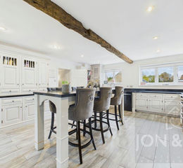 From the hallway, there is access to a study and a dining room (currently used as a games room) featuring exposed beams and steps leading up to the kitchen/breakfast room.