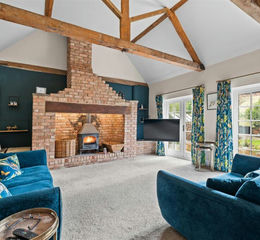 Sitting Room - 5.59m x 5.33m (18'4" x 17'6") - A fantastic space offering a wealth of character the focal point to the room being a beautiful exposed inglenook fireplace with raised brick hearth and inset solid fuel stove with alcoves to the side, the room also having central king post and truss, exposed timber purlins, an internal brick elevation creating a delightful feature and twin French doors leading out into the rear garden.