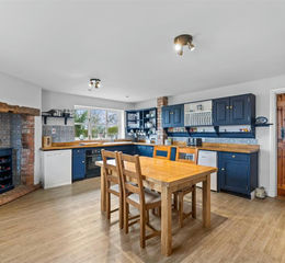 Dining Kitchen - 5.41m x 4.88m (17'9" x 16') - A well proportioned generous space ideal for families being large enough to accommodate a large dining table and flooded with light benefitting from a dual aspect with double glazed windows to the side and rear with wonderful views across adjacent paddocks and countryside beyond. The kitchen is tastefully appointed with a generous range of farmhouse style units finished in heritage colours having butcher's block work surfaces providing an excellent working area, inset ceramic sink and drain unit with chrome mixer tap, integrated appliances including oven with ceramic hob, space for free standing fridge freezer, central heating radiator and attractive feature fireplace with exposed brick work and timber mantel above.