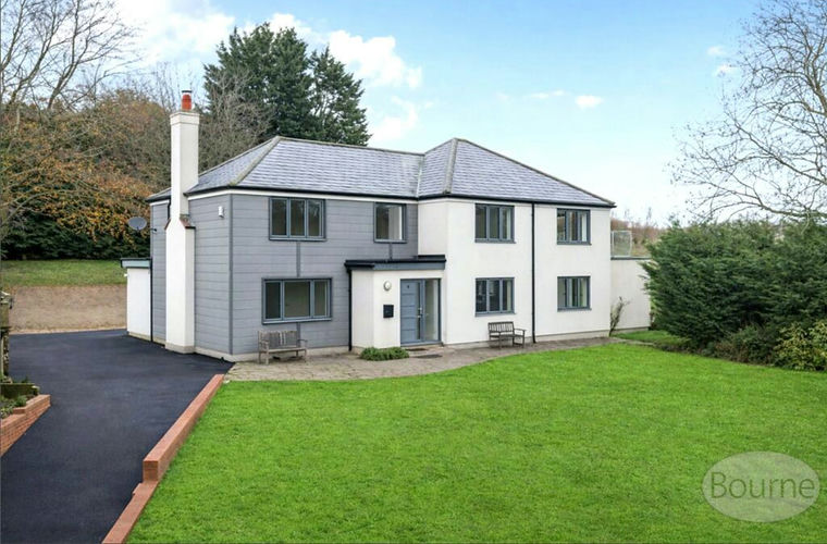 Upstairs, there are four double bedrooms and a modern family bathroom. The main bedroom boasts a walk-in dressing room and an en-suite bathroom with both a bath and enclosed shower. It also benefits from a private balcony offering stunning countryside views.