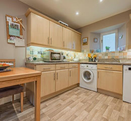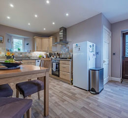 Side external entrance door, wide range of modern kitchen base units with complementary work surfaces, wall units, stainless steel sink with mixer taps, double glazed window, gas hob, Montpellier electric oven with hood over, plumbing for washing machine, recessed spotlights, radiator, cloakroom off.