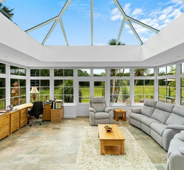 Further along the entrance hall and to the same side as the dining room, double doors open into a recently renovated orangery. Arranged over split levels with a vaulted ceiling and skylight, it is a room of exceptional light and character, perfectly suited for year-round enjoyment.
