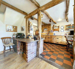 With fitted cupboards and work surfaces, electric double oven and hob, oil fired boiler providing central heating and hot water, quarry tiled floor, tiled splashbacks, ceiling beams, double glazed window to rear and doorway to;