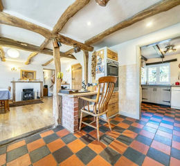 Offering inglenook fireplace with timber lintel and woodburning stove inset, bread oven door feature and stone shelf to side, radiator, beamed ceiling, 2 double glazed windows to rear and door to;