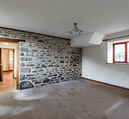 A doorway from the kitchen opens into the central hallway, where stairs rise to the first floor and a useful understairs cupboard provides additional storage. From the hallway, a further door leads into the generous lounge, which features an attractive stone wall and dual-aspect windows that fill the room with light. The final reception room on the ground floor is a cosy snug/sitting room, which benefits from access to a ground floor WC. The snug also features a second staircase leading to the first floor, where there is a completed bedroom and an additional room offering excellent potential for further development. With a separate front door and staircase, this section of the property presents a fantastic opportunity to create an independent unit for holiday letting or private rental, subject to the necessary planning consents.