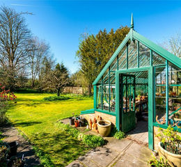 On the north end of the lawn below the main driveway is an over 19 ft. long pitched roof Alitex greenhouse on a brick base with rumbled brick flooring and window blinds. The door is in the gable end and there are brick- based cold frames along one side, bordered by York stone flags.