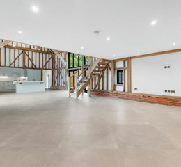 Carefully restored and reimagined, the property retains its original character—exposed oak beams, brickwork, and soaring pitched ceilings—while introducing a refined mix of stone, glass, and timber throughout.