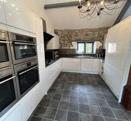 The LIVING ROOM is a very generous size with fitted carpet, exposed stone walls, vaulted ceiling with beams, and a gas fired log effect fire. The LOUNGE and DINING AREA flow naturally into the KITCHEN, which is fitted with grey speckled, granite worktops, a five-burner gas hob with glass extractor, AEG double oven and grill, two additional AEG built-in combi oven/microwave appliances, which together provide sufficient cooking options for the largest of families and discerning cooks, double fridge and freezer, pull-out pantry, and stainless steel sink, vaulted ceilings, Velux windows, and a UPVC barn door allow light to flood the space. A fitted bench in the dining area and a UTILITY SPACE with washer, dryer, and storage complete the practical touches.