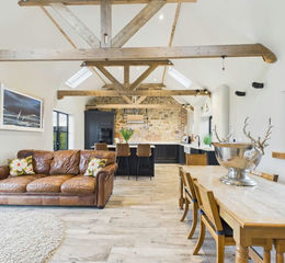 Living Kitchen - a superb space with a real wow factor and lots of space being nearly 26ft long. There are five windows across two aspects including two sets of French doors as well as four Velux windows in the vaulted ceiling which provide lots of light. On entering the kitchen from the hallway, you cannot fail to notice the exposed beams and striking gable end with original bricks mixed with local cobbles which contrast delightfully with the modern Shaker style kitchen. Integrated appliances within the kitchen include a dishwasher, fridge freezer, double oven and induction hob. A central island, the double bowled Belfast sink along with the luxurious white granite work surface complete what is a striking look.