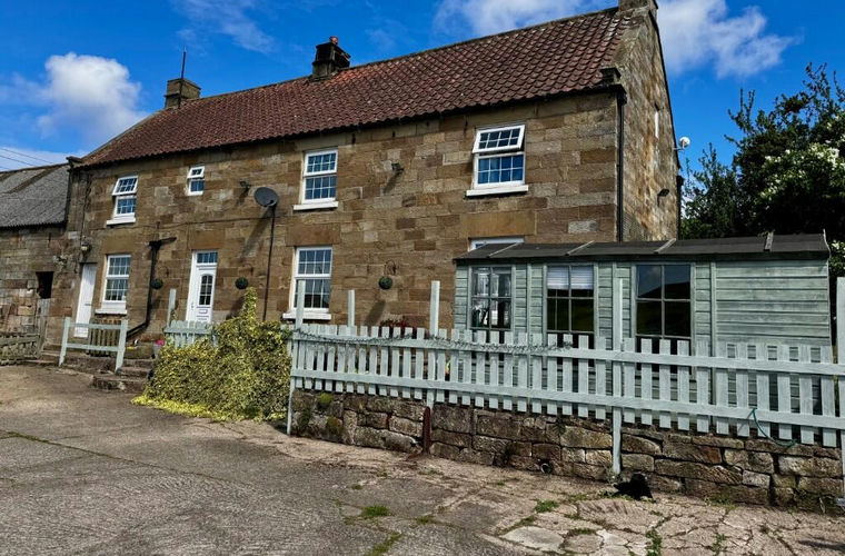 The house has a yard area across the front and a garden at the end of the building with a wooden summerhouse.