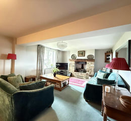 Well-proportioned living room with inglenook fireplace with open grate and oak mantle. Window looking out over the garden, two radiators and central ceiling light.