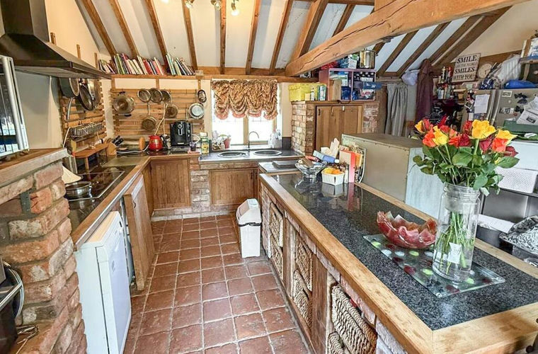 Kitchen/ Dining Room - 5.28m x 4.90m (17'3" x 16'0") - As you enter into the property the kitchen/ dining room is the first room. This spacious character room sets the tone for the whole property having lots of character with vaulted ceilings with structural timbers, wall timbers, beams and exposed brickwork detail to both the walls and the bespoke kitchen units. The kitchen area is fitted with a range of hand built kitchen units with oak doors and inset granite work surfaces. There is a central island with inset granite providing lots of space to cook and prepare food. The kitchen also has an electric hob, plumbing and space for appliances, electric oven with a chimney style extractor fan over, quarry tile flooring and a double bowl sink with mixer taps over. A window to the front and oak door lead to the front whilst full length oak framed windows to the rear let lots of natural light in. A stable door leads out to the rear garden and an oak door leads through to the lounge.