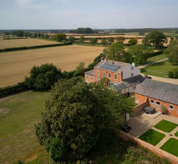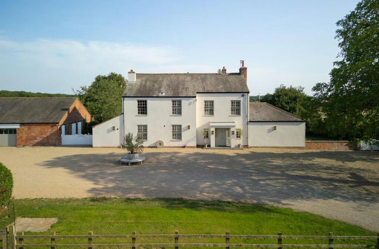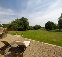Gates on either side of the house enclose a private space at the rear, and lead to a broad gravelled terrace abutting the house, beyond which lies a large expanse of lawn edged with perimeter trees. The garden is very private, bordering open farmland on two sides and with distant woodland views. On the eastern boundary lies a secluded walled garden, landscaped with lawns intersected by gravel pathways and equipped with two outdoor sockets offering the potential to add a hot tub.