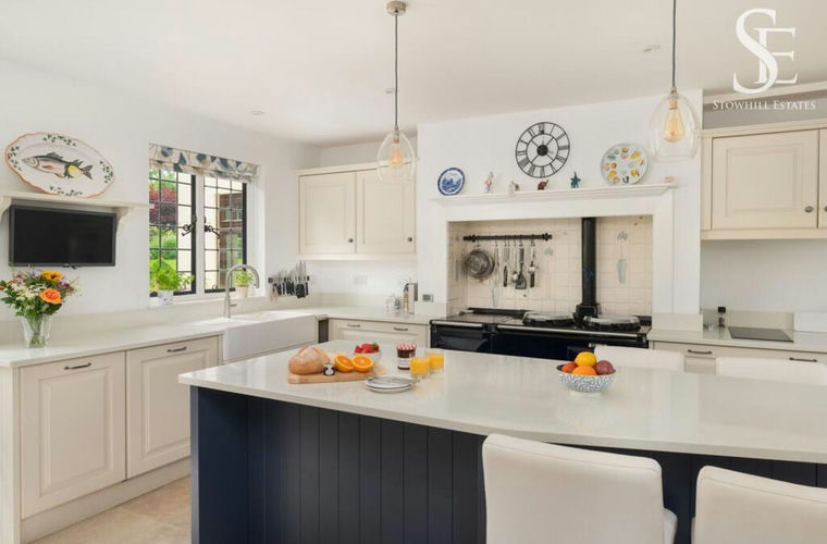 Flowing from here is the heart of the home: a beautiful, sociable kitchen installed in 2021 by John Lewis of Hungerford. With grey tiled flooring and crisp white composite granite worktops, it’s both stylish and functional. A central island seats six with ease, while integrated appliances include an electric four-oven AGA, Neff combi oven, induction hob, fridge, freezer, dishwasher and more. Deep cupboards, a walk-in pantry, and access to a prep area keep everything perfectly organised.