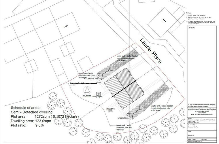 The site has an existing vehicular access and access track. Ground coverage comprises unkept vegetation and rough concrete hard surface. The site slopes slightly upwards away from the public road at Laurie Place, levelling out towards the rear. There are existing bushes at the site frontage with Laurie Place. There is one tree at the site. This tree is not protected by a Tree Preservation Order and has little value in terms of amenity.