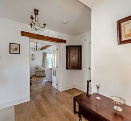 The well-proportioned Living Room 5.8m x 4m includes a central fireplace fitted with a living-flame coal effect gas fire, two sympathetically restored roof timbers adding additional character to the room and windows to either side of the chimney breast provide attractive views across the courtyard to the front and fields beyond.