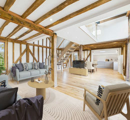 This beautifully refurbished barn style home sits quietly in the centre of Slinfold and offers a rare mix of character, light and modern comfort. Every part has been thoughtfully finished, with exposed timbers, high ceilings and large windows that flood the interior with natural light throughout the day.