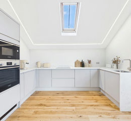 The kitchen has a calm contemporary feel with clean lines, Bosch appliances and a roof window that brings in additional natural light.