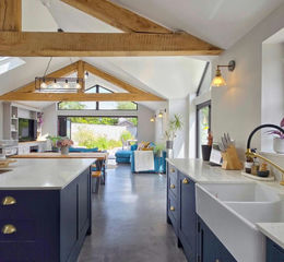 - Beautiful 32ft kitchen/dining/living room with bespoke units, exposed beams and bi-folding doors to garden.