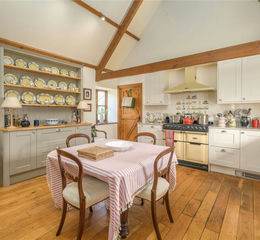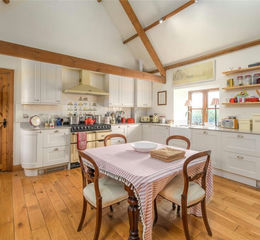 The open-plan kitchen, dining, and sitting area features vaulted ceilings and exposed timber beams. The focal point to the room is the dual aspect log burning stove adding warmth to the rooms.