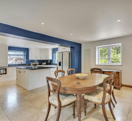 Kitchen - 4.69m x 3.62m (15'4" x 11'10") - The kitchen is truly stunning and is fitted with a range of hand made painted bespoke solid base and wall units with granite work surfaces over and matching up stands, island unit with a granite work surface, space for a double range oven, integrated extractor fan, feature curved units, part tiled walls, double Belfast sink, space for an American fridge, integrated Miele dishwasher and spotlighting. There is a window to the side and the rear letting in lots of light.