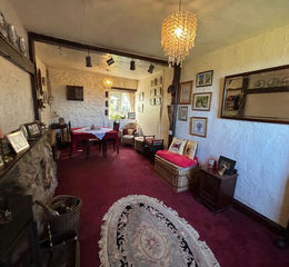 With Inglenook fireplace with wood burning stove, beamed ceiling, two radiators, two windows and natural stone wall.