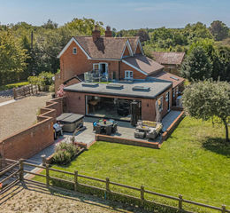 The accommodation offers a degree of flexibility with the third bedroom positioned on the ground floor, ideal as a study or playroom, and comes with a wood burner. The kitchen/dining/family area is the hub of the home, featuring bi-fold doors out to the extensive porcelain patio, skylight windows, underfloor heating, ample room for a dining table and a tv/seating area.