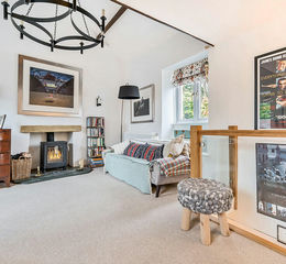 The stairs lead to the real joy of this quirky cottage - a wonderfully welcoming living room with impressive vaulted ceiling showcasing beautiful timber beams, and the added bonus of a mezzanine accessed via stepped "hay barn" style fixed ladder. Whilst this is an excellent storage space it is also currently enjoyed as an occasional additional sleeping area (for those comfortable with the ladder access). There is space in the living room to dine too making this a rather special room to gather as a family, or relax with friends.