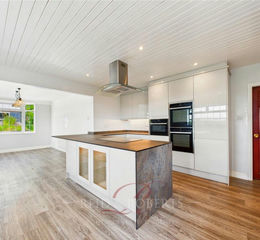 Kitchen - A beautifully renovated, modern kitchen offering an impressive range of high-gloss mocha toned cabinetry with soft close fittings. Intagrated appliances include a built in double eye level oven and microwave grill, five ring electric hob with a contemporary stainless steel extractor, fridge freezer, counter fridge, and dishwasher. A chic breakfast bar offers casual dining, while dual UPVC windows to the rear and side elevations frame serene garden and paddock views. The wood panelled ceiling with inset spotlights and wood effect laminate flooring elevate the space.