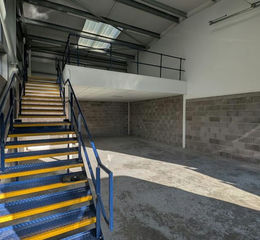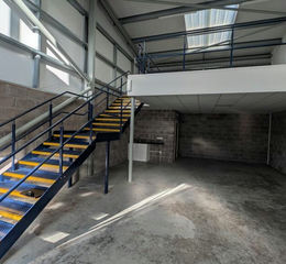 End of terrace unit provides a mix of light industrial and warehouse space with 1st floor mezzanine. The unit is built on a steel portal frame with low-level brick fascia with micro-rib cladding system above under an insulated profile metal sheet roof.