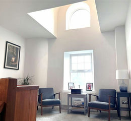 Windows and door to front aspect, open to inner hallway, access to stairwell room, pointed stone walls, decorative flooring.