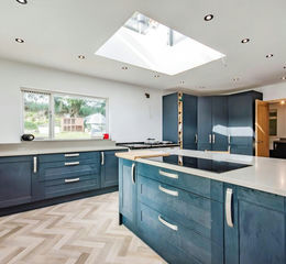 Modern kitchen range with fitted appliances, worktop, Belfast style sink unit, breakfast bar, Aga range cooker, window to rear aspect and window to sun room. Space under worktops for white goods, feature skylight canopy window, door to pantry cupboard.