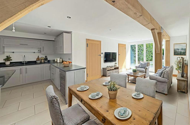 Additionally downstairs there is an open-plan dining/living area with wonderful exposed beams, a bright sitting room, and a double bedroom with an en-suite shower room. There is also a separate utility room with a worktop and sink, fitted units, and space for additional appliances.