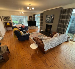 27' x 16' 1" (8.23m x 4.90m). With strip pine flooring, two sliding UPVC patio doors, open fireplace housing a cast iron wood burning stove on a slate hearth, radiator, opening onto the Sun Lounge.