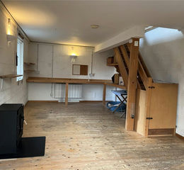 Flooring is a mixture of pine boarding and tile. There is a built-in large desk area with shelving, storage heater, 3 wall lights, pine staircase, imitation wood burning stove (gas) and 2 windows. External wooden stable door leads to backyard/landscaped garden area.