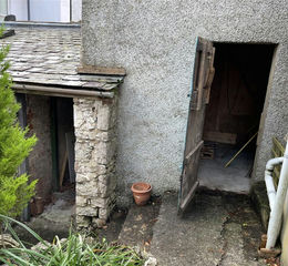 A stone-built building with slate roof, concrete floor. Currently used as a small log store.