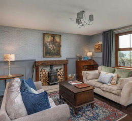 The main house has been modernised with care, balancing a tasteful country aesthetic with robust, practical finishes. At its centre, a generous, marble-topped kitchen pairs shaker-style cabinetry with a large Belfast sink, a central island with log store and wine rack, and integrated appliances including a five-ring gas hob and raised electric oven. A separate utility room supports everyday function, while a WC sits adjacent. Two well-proportioned reception rooms span the front of the house: the first with original wood flooring, panelled walls, a decorative inglenook fireplace and south-facing views across the valley; the second with panelled walls and an impressive traditional inglenook fireplace with wood burner and space for a formal dining table. Upstairs, the principal bedroom enjoys open views and excellent natural light, with a private en-suite shower room and separate dressing room adjacent. Two further bedrooms share a family bathroom and look out across the surrounding farmland.