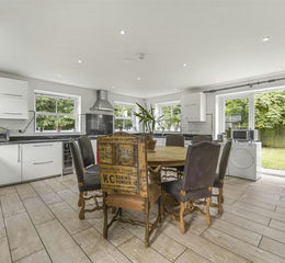 Kitchen/Dining Room - 6.05m x 5.87m (19'10 x 19'3) - Attractive white high gloss fitted kitchen with range of wall and base units with sleek chrome handles set under and over a granite worksurface with matching upstand. Metro tiled splashbacks. Fully skimmed walls. Skimmed ceiling with LED spotlighting. Features to include; integrated oven over fridge/freezer. Integrated wine cooler. Britannia range cooker and hob in a deep red palette with overhead chrome chimney extractor. Double inset sink with grooved drainer and chrome mixer tap. Plenty of space for washing machine and tumble dryer. Red brick pelmet chimney breast with inset Aga and warming tray. Plenty of space for dining table and chairs, Matching tiled flooring. UPVC half glazed pedestrian door leads out to side. UPVC double glazed patio doors open out onto side elevation. Range of UPVC double glazed sash windows.