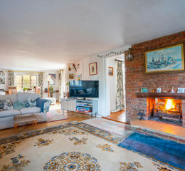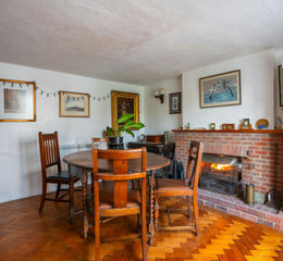The front door opens into a welcoming entrance hall / snug with a tiled fireplace, where a gas-fired Rayburn stove boiler resides, emanating warmth and comfort. A cosy dining room connects the entrance hall to the main open plan living space, with a distinctive brick open fireplace providing a harmonising blend between living areas.