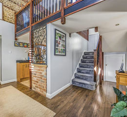 The property is entered via a welcoming and generously proportioned entrance hall. To one side lies an impressive open-plan kitchen and living space, centred around a striking brick fireplace and complemented by vaulted ceilings that create a wonderful sense of light and volume. This inviting area flows effortlessly into the conservatory, where patio doors open directly onto the garden. The modern kitchen/dining area is thoughtfully designed with integrated appliances, ample storage, and sufficient space for a full family dining table.