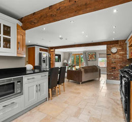 At the centre of the house lies the bespoke oak kitchen, appointed with granite worksurfaces, a three-oven Aga with companion, Belfast sink, integrated appliances, and a breakfast bar. Bi-fold doors open directly onto the walled garden, seamlessly blending indoor and outdoor living. A dual-aspect drawing room, with an impressive stone fireplace, and a separate dining room framed by a stone mullion bay window provide refined formal living spaces.