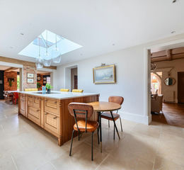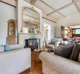 The front door opens to a charming entrance hall with herringbone brick flooring leading to both a large boot room and the kitchen / family room. The kitchen is beautifully finished with Mark Wilkinson units and a range of integrated appliances. There is also a central island unit with electric hob and breakfast bar. The kitchen forms the heart of the house and has direct access to both the formal sitting room and the more informal, cosy family room. Both the sitting room has a wood burning stove and door to the annexe; both sitting room and family room have doors directly onto the garden. Completing the ground floor is a beautiful drawing room with vaulted ceiling, French windows to the garden and wood burning stove. Beyond the drawing room is a further room currently used as an office.