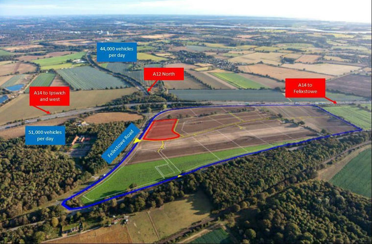 Daily traffic flows recorded on the A14 amount to 51,500 vehicles per day (2022) and on the A12 44,000 vehicles per day. The development will be accessible to both east and west bound traffic on the A14 together with the A12 which heads north/east to the Suffolk coast.