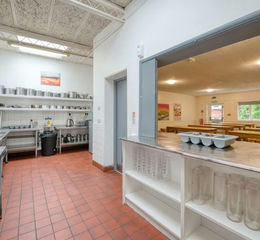 The accommodation features a spacious lounge with a library, a wood-burning stove, a TV, and Wi-Fi, providing a cozy and relaxing environment. The fully equipped kitchen is designed for group catering, boasting two large fridges, a chest freezer, ten electric hobs, two large ovens, and steel catering surfaces. The dining area is well-appointed to serve and seat up to 60 guests comfortably.