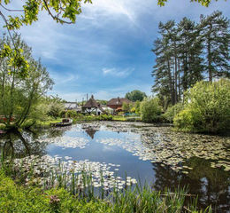 Sizable pond surrounded by a range of planting