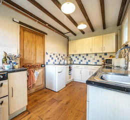 Offering fitted wall and base cupboards, 1 & 1/2 bowl sink, electric cooker point, plumbing for dishwasher, oil fired boiler providing central heating and hot water, tiled splashbacks, beamed ceiling and external door to side.